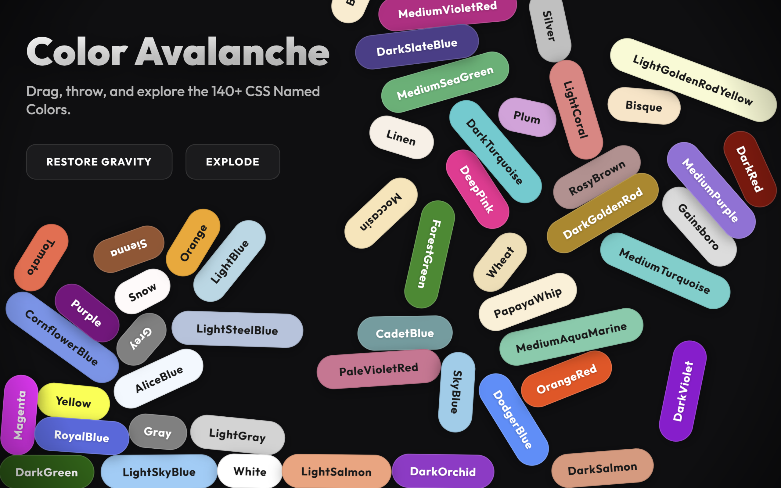 This HTML builds the structure for the Color Avalanche project. It loads the Outfit font and external CSS, then creates a UI layer with a title, short description, and two buttons to control gravity and explosion effects. Below that, a container is added where the animated color elements will appear. A hidden unordered list stores all 140+ CSS named colors, which JavaScript later reads to generate the falling color pills dynamically. At the bottom, it loads the project scripts along with the Matter.js physics library that powers the movement, collisions, and interactions.