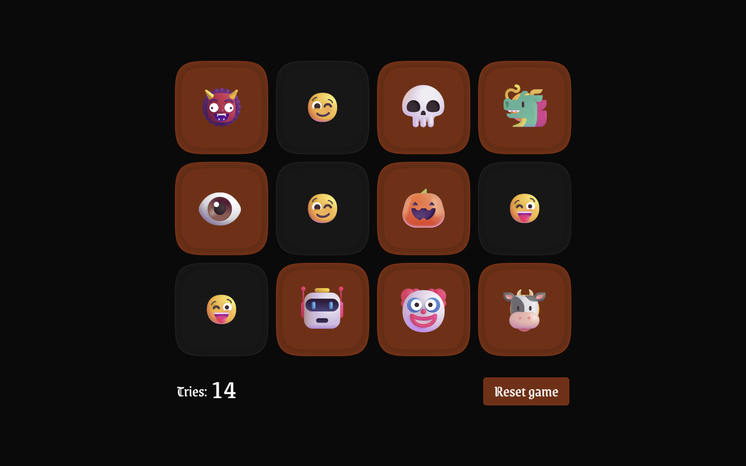 <!DOCTYPE html> <html lang="en"> <head> <meta charset="UTF-8"> <title>Memory Unmasked Game | @coding.stella</title> <meta name="viewport" content="width=device-width, initial-scale=1"> <link rel="stylesheet" href="https://public.codepenassets.com/css/reset-2.0.min.css"> <link rel="stylesheet" href="./style.css"> </head> <body> <main> <div class="game"> <div class="board is-loading"> <button id="alien" class="card"> <div class="content"> <span class="face">🙂</span> <div class="prop"> <div class="alien-mask"> <span class="mask">👽</span> <span class="hand">🫰</span> </div> </div> </div> </button> <button id="ogre" class="card"> <div class="content"> <span class="face">🙂</span> <div class="prop"> <div class="ogre-mask"> <span class="hand">🫸</span> <span class="mask">👹</span> <span class="hand">🫷</span> </div> </div> </div> </button> <button id="robot" class="card"> <div class="content"> <span class="face">🙂</span> <div class="prop"> <div class="robot-mask"> <span class="mask">🤖</span> <span class="hand">🫳</span> </div> </div> </div> </button> <button id="clown" class="card"> <div class="content"> <span class="face">🙂</span> <div class="prop"> <div class="clown-mask"> <span class="hand">🫸</span> <span class="mask">🤡</span> <span class="hand">🫷</span> </div> </div> </div> </button> <button id="pumpkin" class="card"> <div class="content"> <span class="face">🙂</span> <div class="prop"> <div class="pumpkin-mask"> <span class="mask">🎃</span> <span class="hand">🫳</span> </div> </div> </div> </button> <button id="frog" class="card"> <div class="content"> <span class="face">🙂</span> <div class="prop"> <div class="frog-mask"> <span class="mask">🐸</span> <span class="hand">🫰</span> </div> </div> </div> </button> <button id="skull" class="card"> <div class="content"> <span class="face">🙂</span> <div class="prop"> <div class="skull-mask"> <span class="mask">💀</span> <span class="hand">👌</span> </div> </div> </div> </button> <button id="cow" class="card"> <div class="content"> <span class="face">🙂</span> <div class="prop"> <div class="cow-mask"> <span class="mask">🐮</span> <span class="hand">🫳</span> </div> </div> </div> </button> <button id="disguise" class="card"> <div class="content"> <span class="face">🙂</span> <div class="prop"> <div class="disguise-mask"> <span class="hand">🫸</span> <span class="mask">🥸</span> <span class="hand">🫷</span> </div> </div> </div> </button> <button id="eye" class="card"> <div class="content"> <span class="face">🙂</span> <div class="prop"> <div class="eye-mask"> <span class="mask">👁️</span> <span class="hand">👌</span> </div> </div> </div> </button> <button id="dragon" class="card"> <div class="content"> <span class="face">🙂</span> <div class="prop"> <div class="dragon-mask"> <span class="mask">🐲</span> <span class="hand">🫰</span> </div> </div> </div> </button> <button id="fox" class="card"> <div class="content"> <span class="face">🙂</span> <div class="prop"> <div class="fox-mask"> <span class="mask">🦊</span> <span class="hand">🫰</span> </div> </div> </div> </button> </div> <div class="marquee"> <span class="marquee-text">Unmasked!</span> </div> </div> <div class="interface"> <div class="interface-data interface-data-tries">Tries: <span class="tries-value">0</span></div> <div class="interface-data interface-data-best">Best: <span class="best-value">0</span></div> <button id="reset-game" class="interface-btn">Reset game</button> </div> </main> <script src="./script.js"></script> </body> </html>